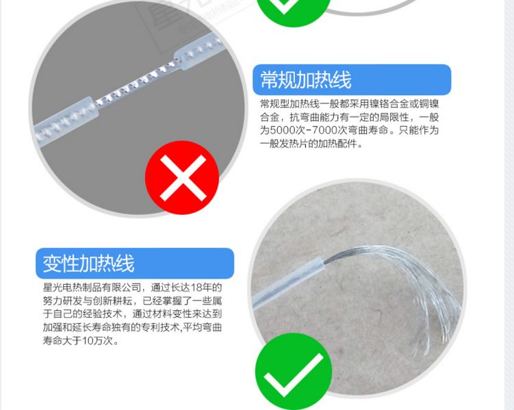 老式发热片多采用网状碳纤维或螺旋式发热线为加热导体,碳纤维加热片易出现局部烧穿,起火的现象,主要为网状碳纤维和边缘铜带无法进行有效的导电性能造成的,螺旋式发热线易出现断丝的情况,其主要表现用户的使用习惯和环境为运动型,发热丝毕竟是金属物体,在重力和运动的模式下,导致发热丝断裂只是时间问题.