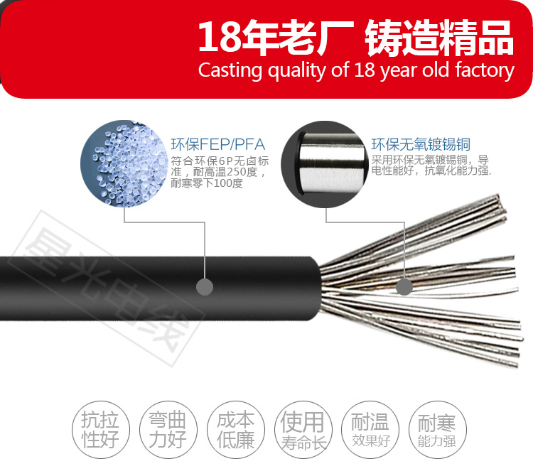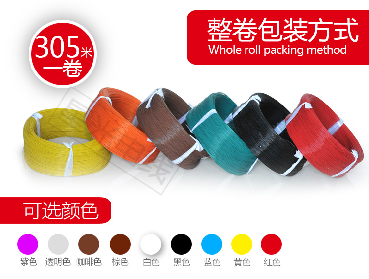 铁氟龙线简称铁氟龙电线及铁氟龙电子线,又叫铁氟龙高温线,具有优良的耐高温及耐低温性能、具有优良的耐高压、耐老化性能、耐高温、几乎不溶于任何有机溶剂,可抗油,强酸,抗强碱,强氧化剂等;具有优良的电绝缘性, 高频损耗小,不吸潮,绝缘电阻大;具有优良的耐燃,使用寿命长。用途说明:绝缘采用铁氟龙<FEP-PFA>,颜色为:白、红、黑、蓝、绿、黄、透明等。使用寿命长易软便于安装。广泛应用于照明灯具、家用电器、电热电器、仪表仪器、电机引接线及电子、灯具、染具等高温线环境。